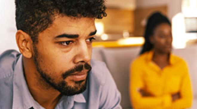 Un homme assis sur un canapé regarde dans le vague. Une femme assise à côté de lui le tient par l'épaule.